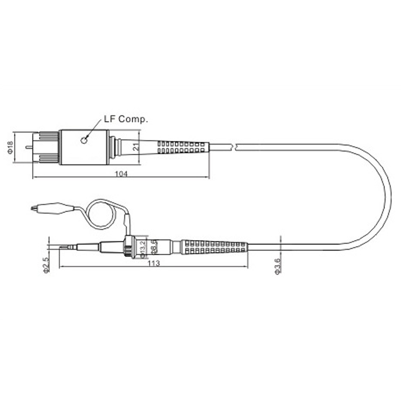 含探头主机一根;中文说明书一份;12cm鳄鱼夹接地线一根;可伸缩测试钩一个;探头区分色环一对;绝缘护尖帽一个;无感调整起子一个;BNC公头到2.5mm示波器探头端适配器一个。