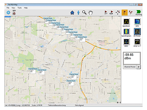 MAP:绘制地图• 将 SignalVu-PC 的测量集成到地图上的位置,可以在户外与全球卫星导航接收机配合使用,也可以在室内使用 • 与 GPS 和其他全球卫星导航接收机相集成 • 基于出行的时间或距离反复绘制测量图 |